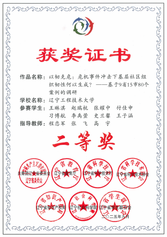 “挑战杯”被誉为中国大学生科技创新的“奥林匹克”,本届赛事共吸引全省95所高校、20万余学生参赛,最终仅8%的项目入围终审决赛。学院由程恋军、张飞和高宇老师指导的,王琳淇等8名本科生撰写的调研报告《以韧克危:危机事件冲击下基层社区组织韧性何以生成?——基于9省15市80个案例的调研》荣获二等奖。