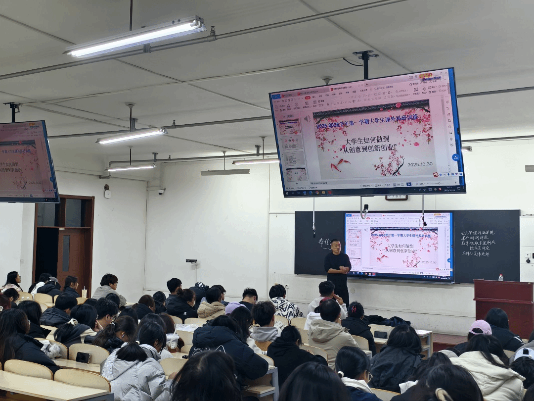为培养大学生创新思维、赋能创业实践,10月30日晚,公共管理与法学院团委在北校区开展了大学生如何做到“从创意到创新创业”为主题的课外科研讲座,学院学生积极参与本次活动。本次讲座由吴伟老师主讲,2024级公共管理与法学院财务管理专业的学生参加了本次活动。